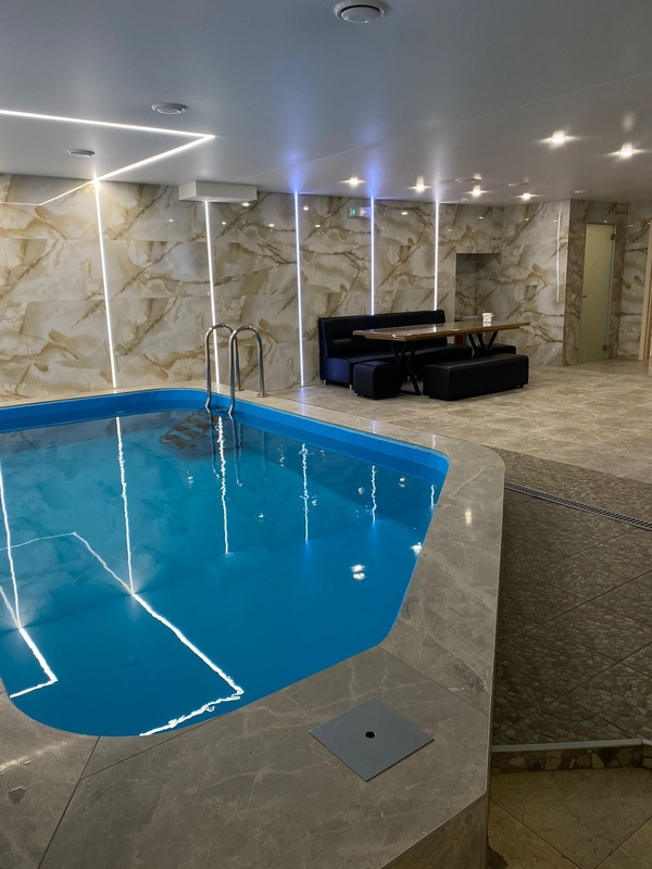 Просторный зал рассчитанный на большую компанию до 8 чел (максимальная вместимость 12 чел). Финская парная. Комната отдыха. Бассейн 6х3м. Массажное кресло. Температура воды в бассейне 24-26 градусов, глубиной 140-160 см.